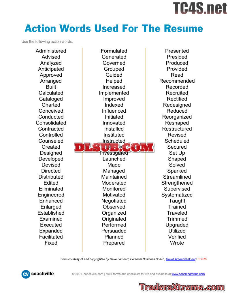 Action Words Used For The Resume - JPG Image File