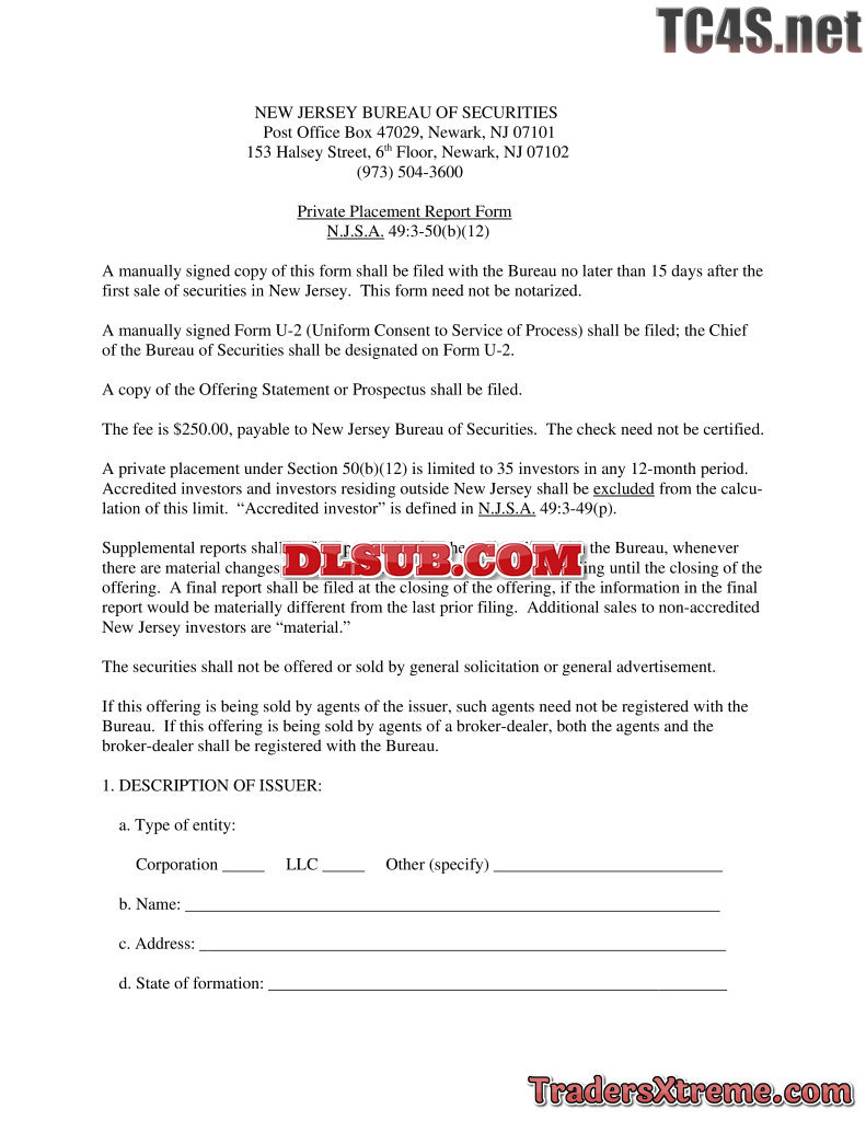 New Jersey Private Placement Report Form - JPG Image File